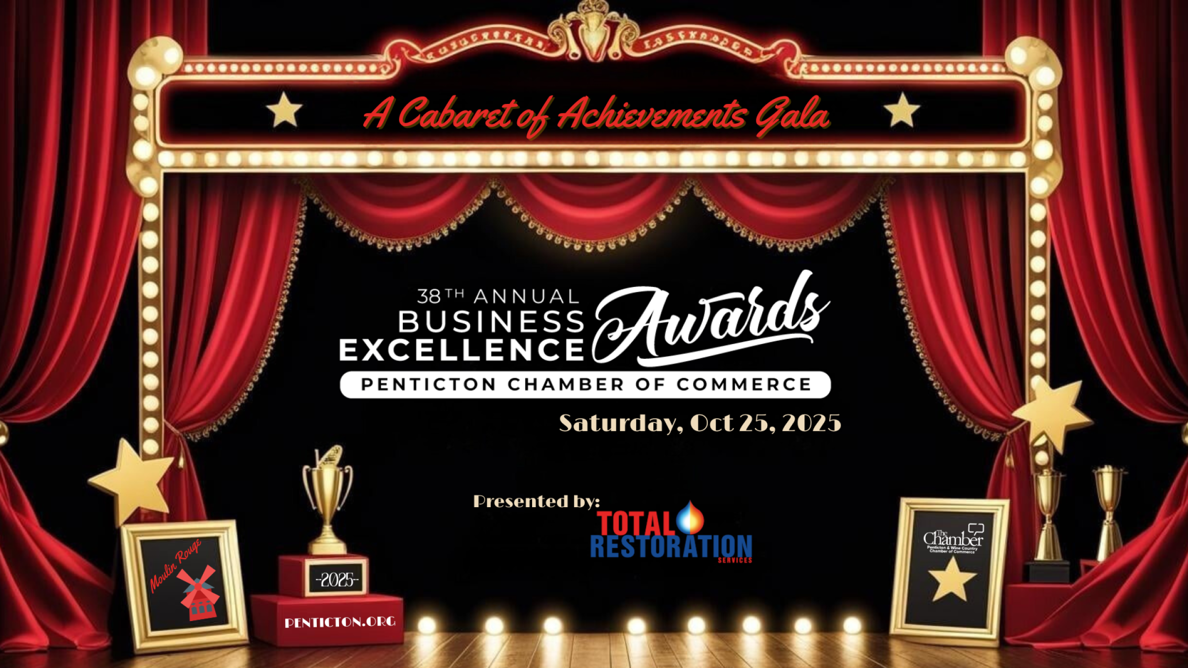 Join us for an unforgettable evening of celebration and connection at the 38th Annual Business Excellence Awards Gala – A Cabaret of Achievements, presented by Total Restoration Services – South Okanagan.